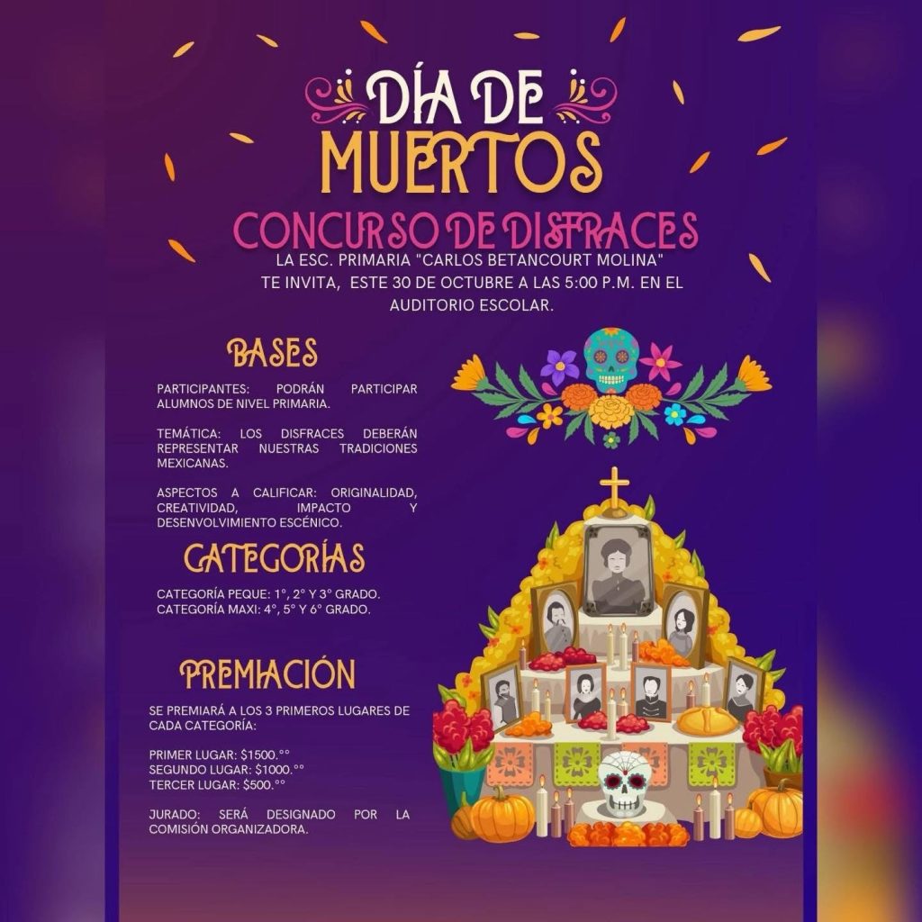 La Escuela Primaria “Carlos Betancourt Molina” invita a sus estudiantes y a la comunidad escolar a participar en el Concurso de Disfraces con temática tradicional mexicana, que se llevará a cabo el miércoles 30 de octubre a partir de las 5:00 de la tarde, en las instalaciones del plantel.