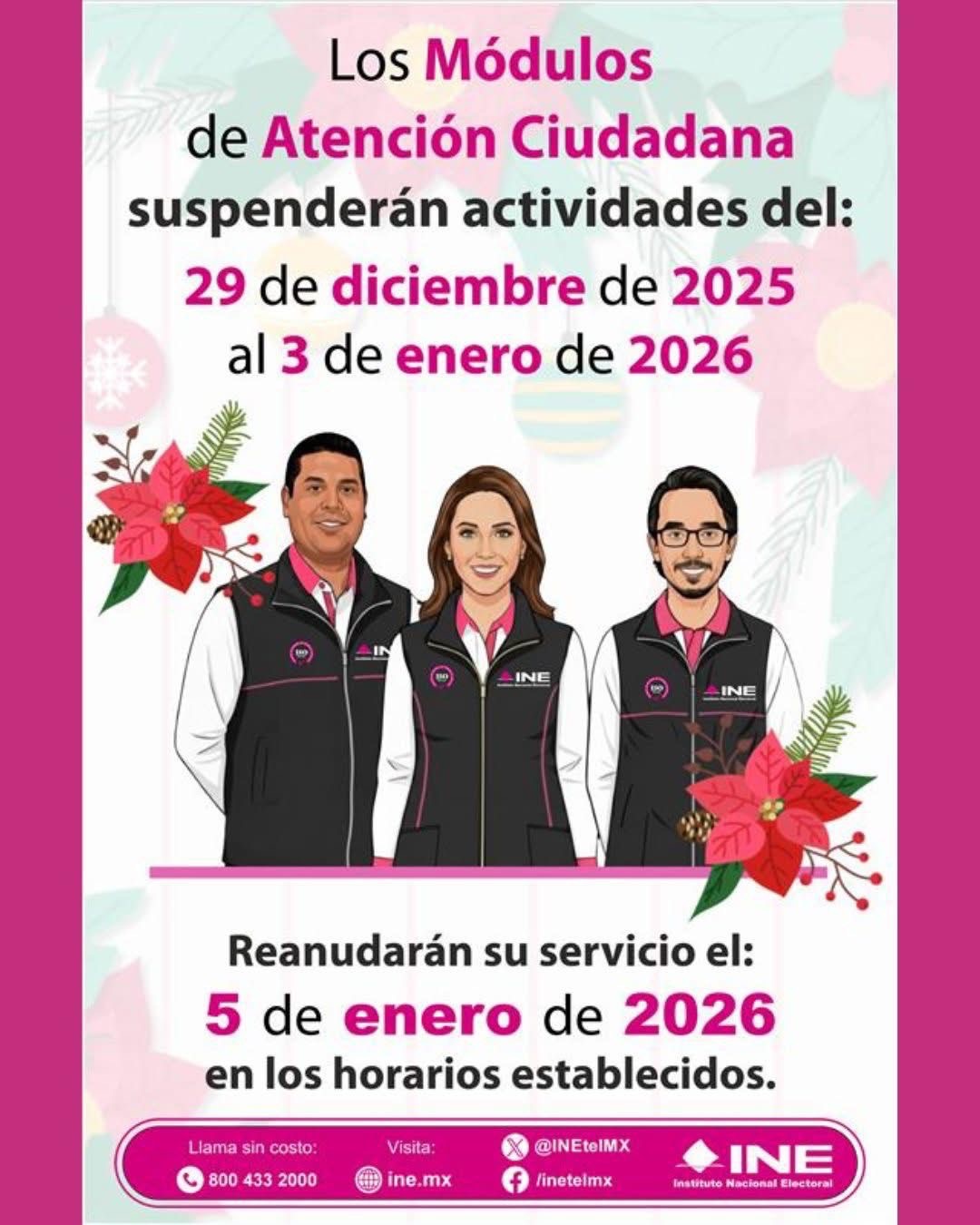 Asimismo, se dio a conocer que las actividades se reanudarán de manera normal el próximo 5 de enero de 2026, por lo que se invita a la población a tomar previsiones y programar con anticipación sus trámites.